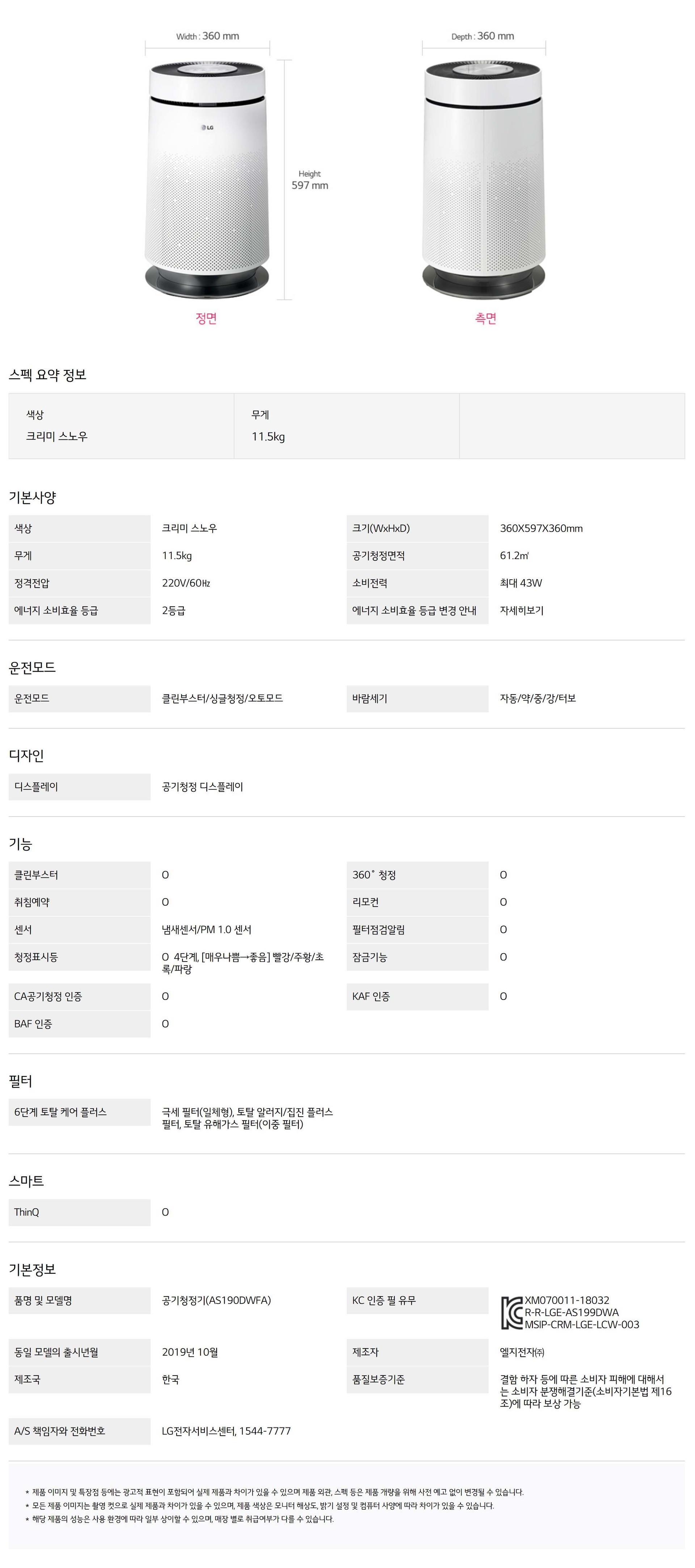 LG전자 퓨리케어 360˚ 공기청정기 AS190DWFA