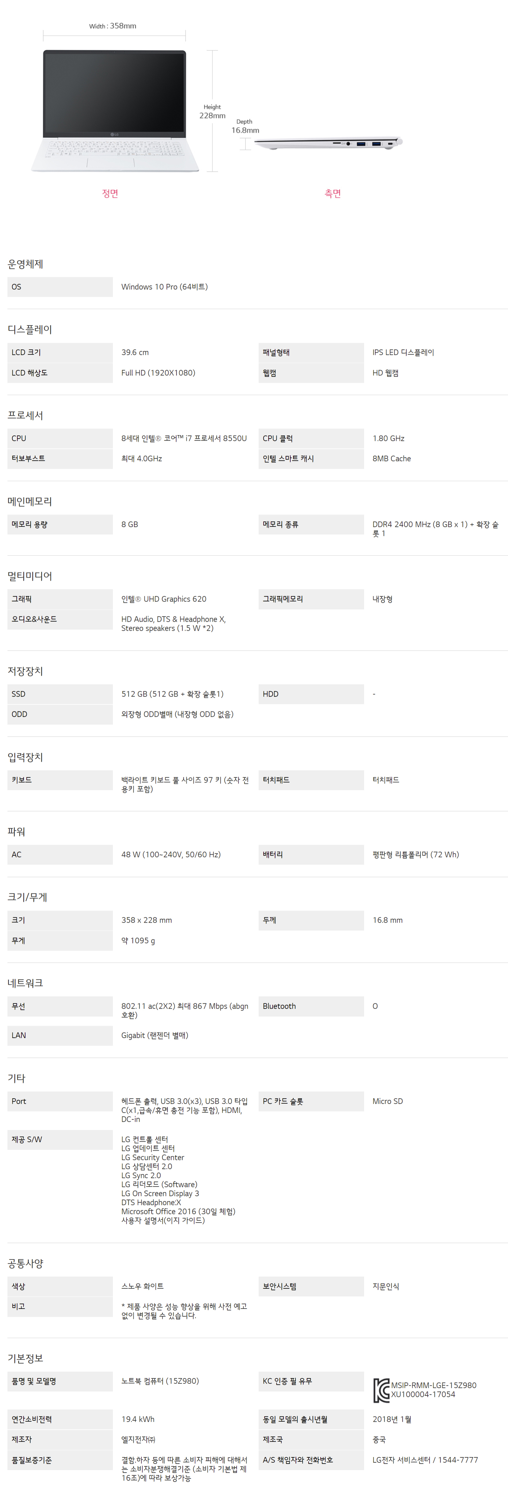 - 프로세서 : 8세대 인텔® 코어™ i7 프로세서 8550U 1.80 GHz