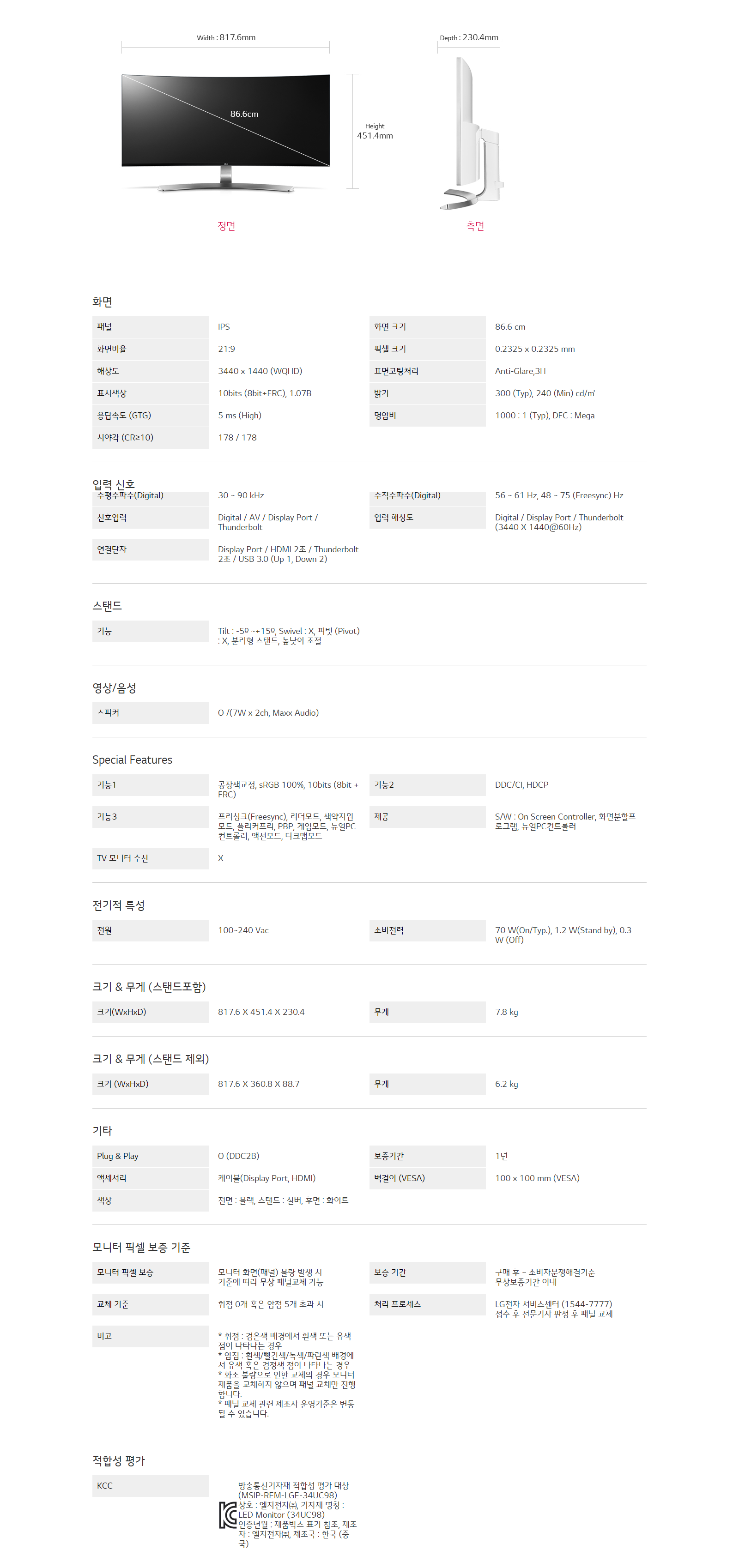 LG전자 곡면 울트라와이드 모니터 34UC98